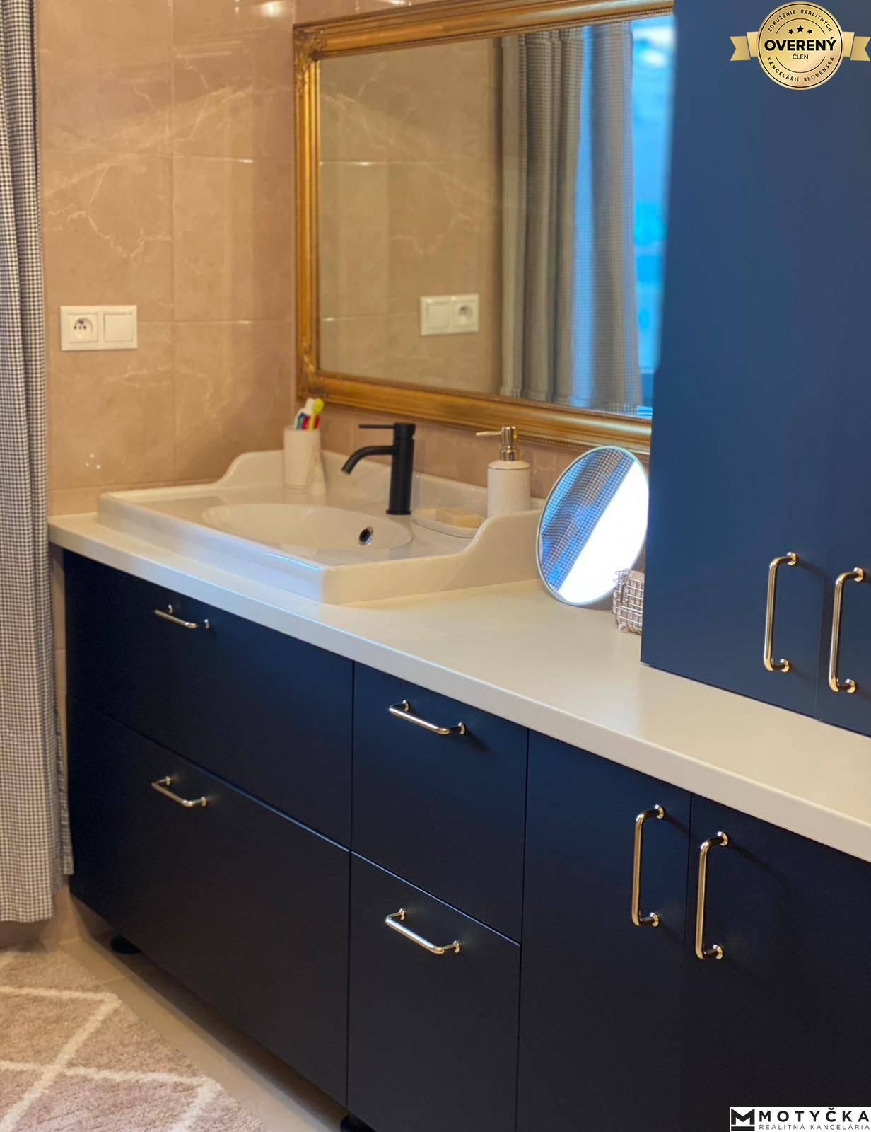 Súčasťou bytu je moderne zariadená kúpeľňa s citom pre detail, v ktorej sa nachádza vaňa, wc, umývadlo ako aj na mieru vyrobený nábytkom. V kúpeľni sa nachádza aj práčka a samostatná sušička, ktoré sú taktiež predmetom predaja.