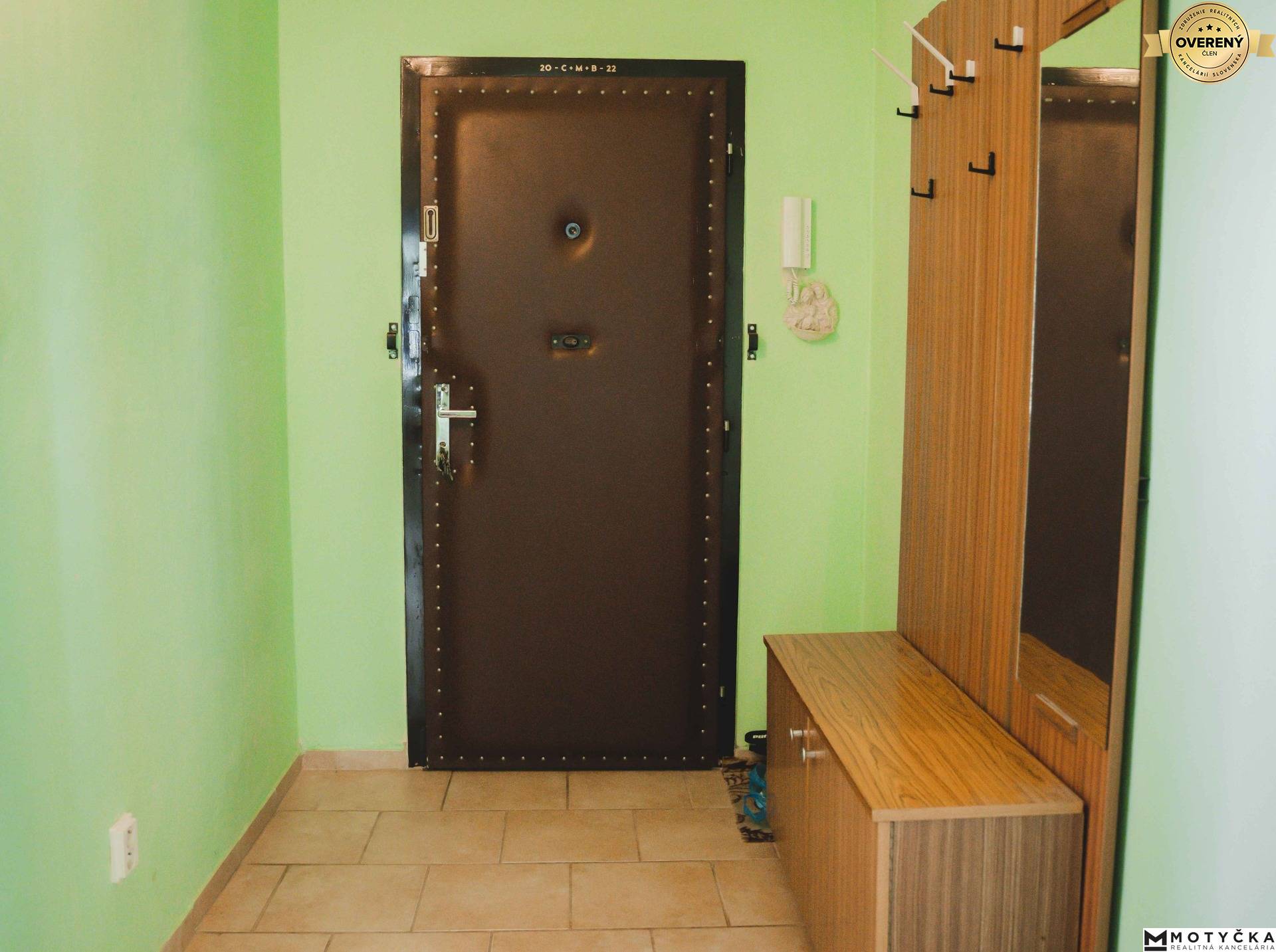 V bytovom dome sú k dispozícii 2 výťahy. Po vystúpení z výťahu sa ocitnete v spoločnej, samostatne uzamykateľnej predchodbe, odkiaľ sa dostanete k vstupným dverám bytu. Hneď po vstupe do bytu vľavo nájdete miestnosť s rozlohou približne 2x2m určenú na úložný priestor. Z pravej strany chodby vedie vstup do izby, určenej ako hlavná spálňa.